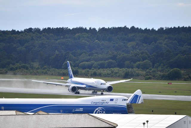 ファンボロー航空ショーで展示飛行を終えて着陸するANAの787-9=16年7月13日 PHOTO: Tadayuki YOSHIKAWA/Aviation Wire