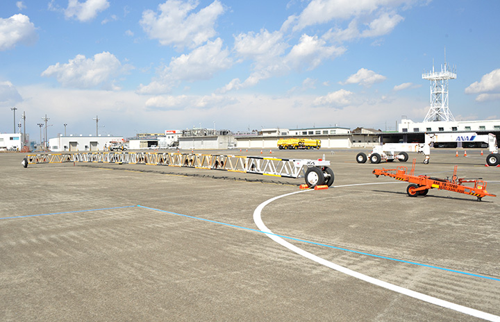 JGSの747ダミー器材(左)とNRTASのトーバー=17年3月10日 PHOTO: Yusuke KOHASE/Aviation Wire