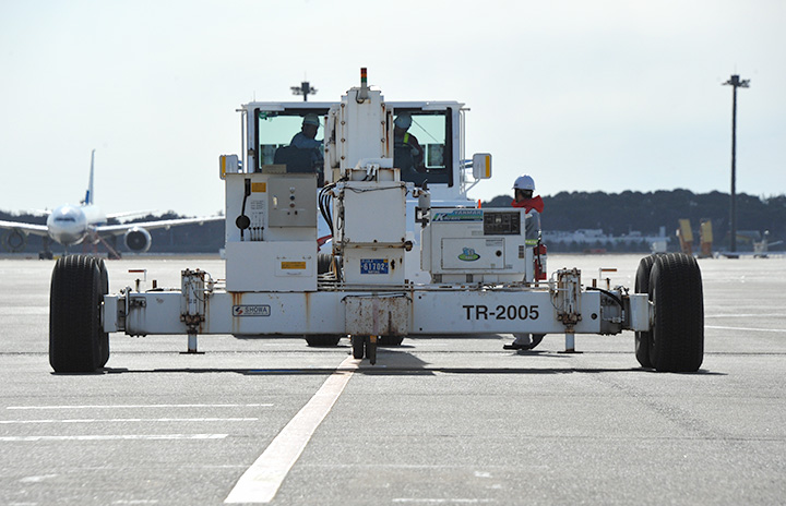 NRTASの737ダミー器材でS字プッシュバックに挑むJGSのグラハンスタッフ=17年3月10日 PHOTO: Yusuke KOHASE/Aviation Wire