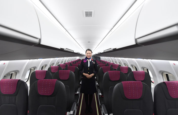 ATR42の機内に立つJACの客室乗務員=17年3月10日 PHOTO: Tadayuki YOSHIKAWA/Aviation Wire