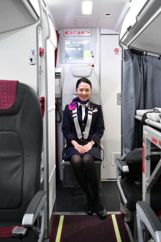 ATR42のジャンプシートに座るJACの客室乗務員=17年3月10日 PHOTO: Tadayuki YOSHIKAWA/Aviation Wire