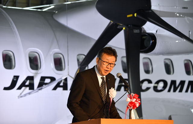 ATR42の初号機をお披露目するJACの加藤社長=17年3月10日 PHOTO: Tadayuki YOSHIKAWA/Aviation Wire