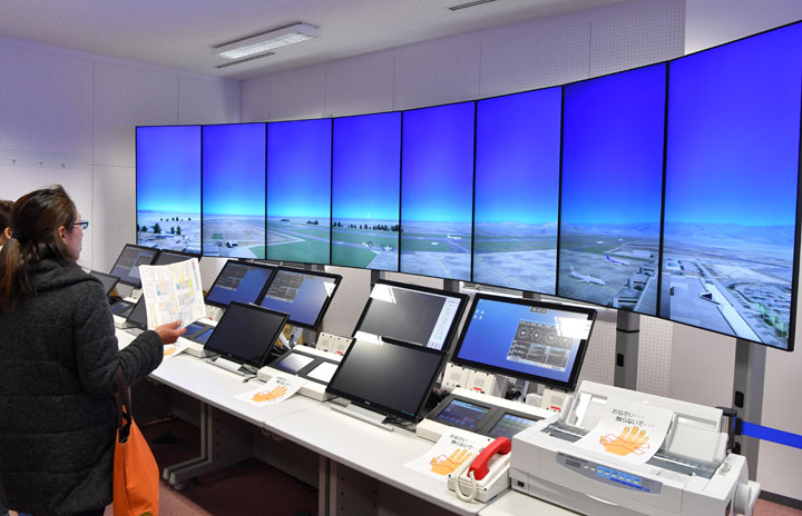 8枚のタテ型ディスプレイが並ぶ航空保安大の飛行場管制用新型シミュレーター=17年3月18日 PHOTO: Tadayuki YOSHIKAWA/Aviation Wire