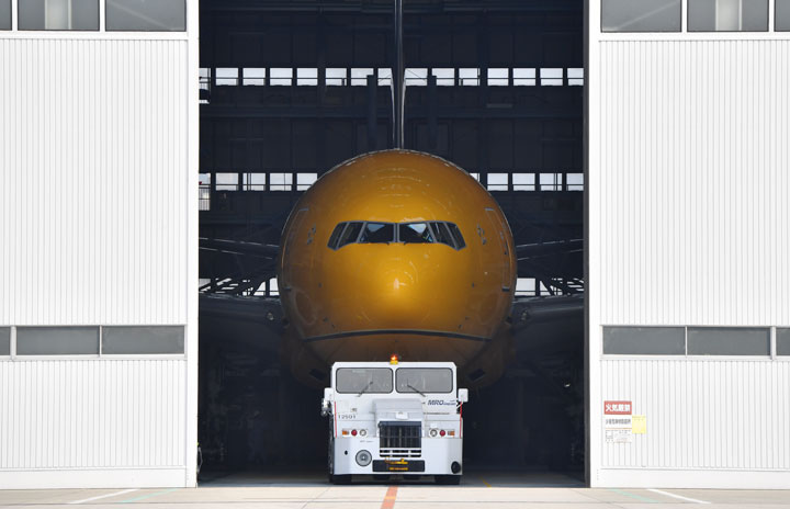伊丹空港の格納庫でペイントロールアウトしたANAのC-3POジェット=17年3月19日 PHOTO: Tadayuki YOSHIKAWA/Aviation Wire