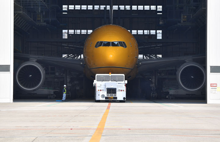 伊丹空港の格納庫でペイントロールアウトしたANAのC-3POジェット=17年3月19日 PHOTO: Tadayuki YOSHIKAWA/Aviation Wire