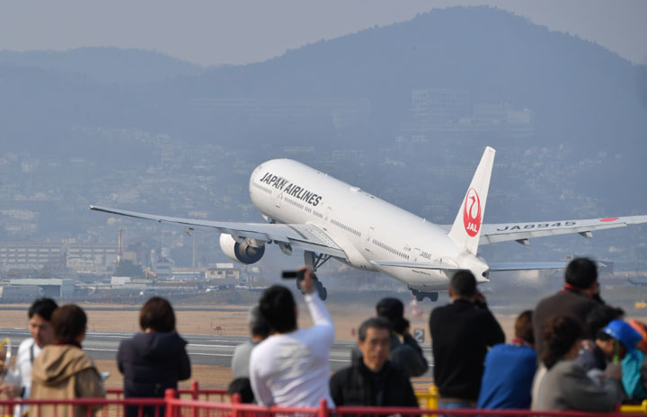 伊丹空港を離陸するJALの777=17年3月19日 PHOTO: Tadayuki YOSHIKAWA/Aviation Wire