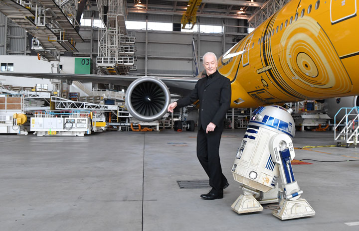 R2-D2とともにANAのC-3POジェットの前を歩くダニエルズさん=17年3月20日 PHOTO: Tadayuki YOSHIKAWA/Aviation Wire