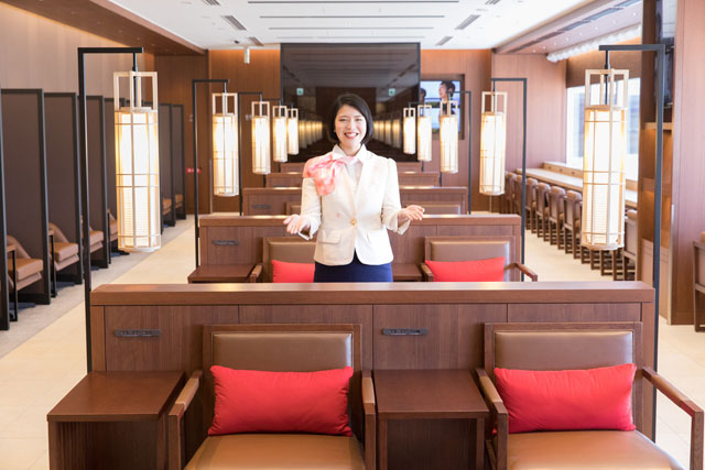 福岡の伝統工芸の八女提灯をあしらったサクララウンジのシート。電源、バッグの収納を備える=17年3月28日 PHOTO: Tatsuyuki TAYAMA/Aviation Wire