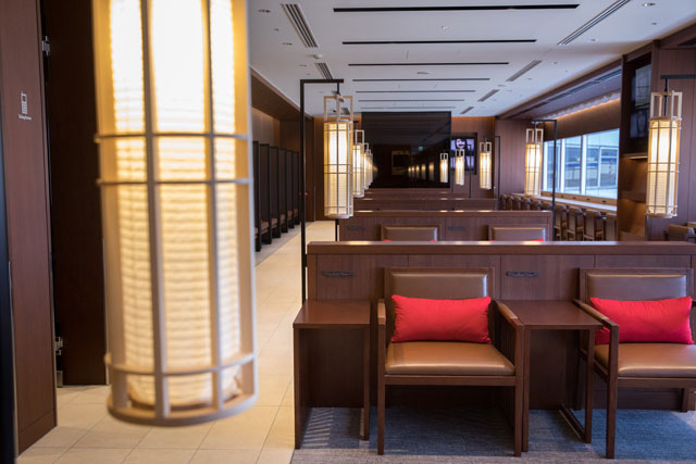 福岡の伝統工芸の八女提灯をあしらったサクララウンジのシート。電源、バッグの収納を備える=17年3月28日 PHOTO: Tatsuyuki TAYAMA/Aviation Wire