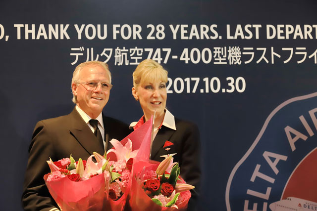 成田空港の搭乗口前で開かれた747日本路線退役セレモニーで写真撮影に応じるデルタ航空のプレスリー副操縦士夫妻=17年10月30日 PHOTO: Youichi KOKUBO/Aviation Wire