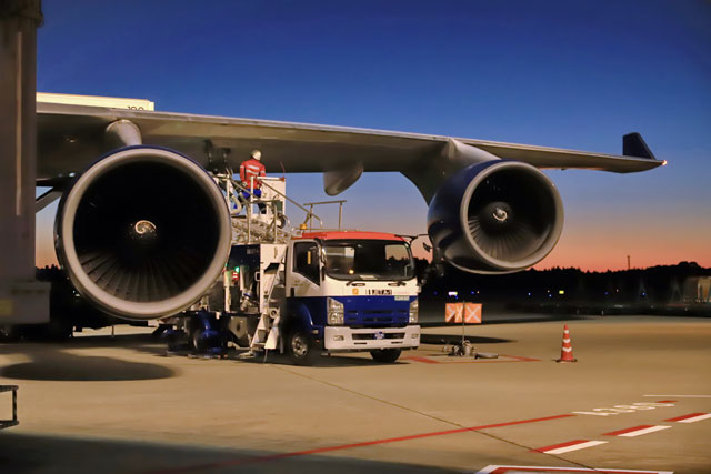 成田空港で給油を受けるデルタ航空の747日本路線最終便となったデトロイト行きDL276便=17年10月30日 PHOTO: Youichi KOKUBO/Aviation Wire