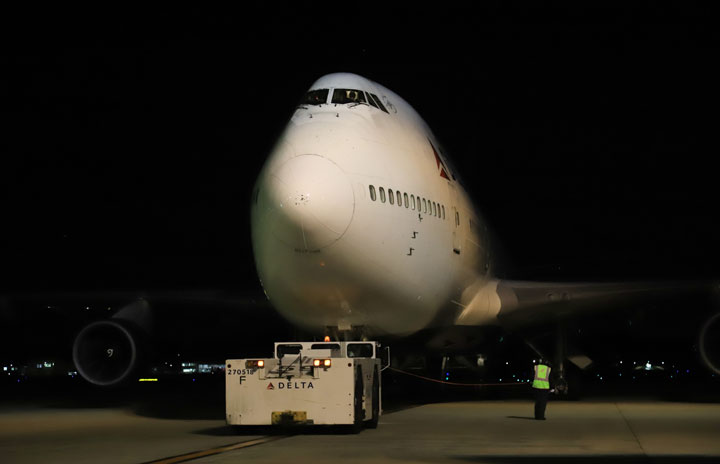 成田空港を出発するデルタ航空の747日本路線最終便となったデトロイト行きDL276便=17年10月30日 PHOTO: Youichi KOKUBO/Aviation Wire