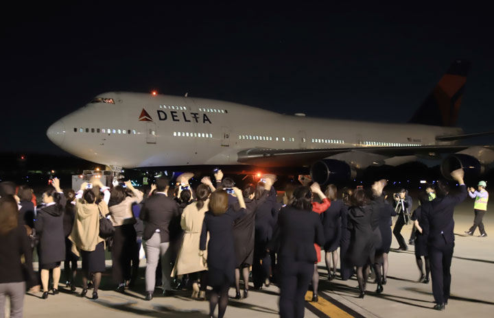 成田空港を出発するデルタ航空の747日本路線最終便となったデトロイト行きDL276便を見送る社員ら=17年10月30日 PHOTO: Youichi KOKUBO/Aviation Wire