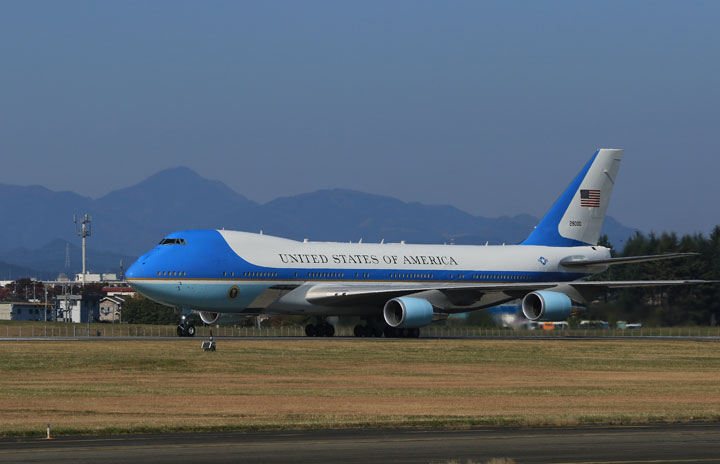 米軍横田基地の駐機場へ向かう大統領専用機VC-25A初号機=17年11月5日 PHOTO: Youichi KOKUBO/Aviation Wire