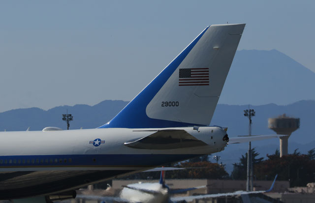 トランプ大統領を乗せ米軍横田基地の駐機場へ向かう大統領専用機VC-25Aの2号機=17年11月5日 PHOTO: Youichi KOKUBO/Aviation Wire