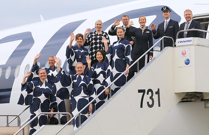 キヴェット柄の浴衣を着用するフィンエアーの客室乗務員=17年11月15日 PHOTO: Youichi KOKUBO/Aviation Wire