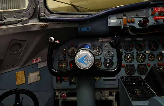 操縦桿に日航製のロゴが入った元航空自衛隊の要人輸送用YS-11の機長席=17年11月20日 PHOTO: Tadayuki YOSHIKAWA/Aviation Wire