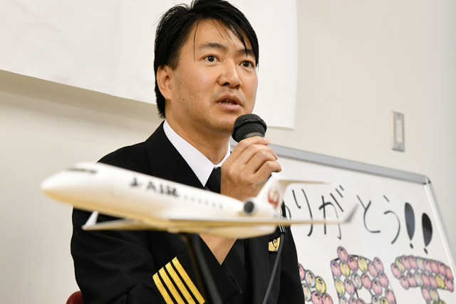 CRJの魅力を語るジェイエアの服部機長=17年11月26日 PHOTO: Tadayuki YOSHIKAWA/Aviation Wire