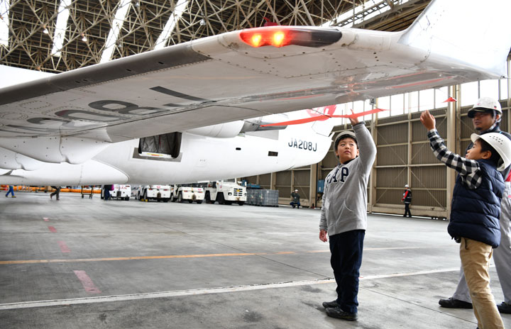 CRJの主翼を見学する男の子=17年11月26日 PHOTO: Tadayuki YOSHIKAWA/Aviation Wire