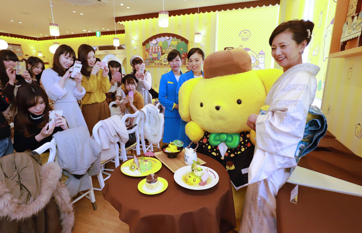 原宿のポムポムプリンカフェで奄美とのコラボメニューを発表するバニラエアの山室美緒子副社長=17年12月3日 PHOTO: Youichi KOKUBO/Aviation Wire