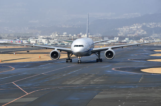 伊丹空港を出発するANAの777-200=18年1月27日 PHOTO: Tadayuki YOSHIKAWA/Aviation Wire