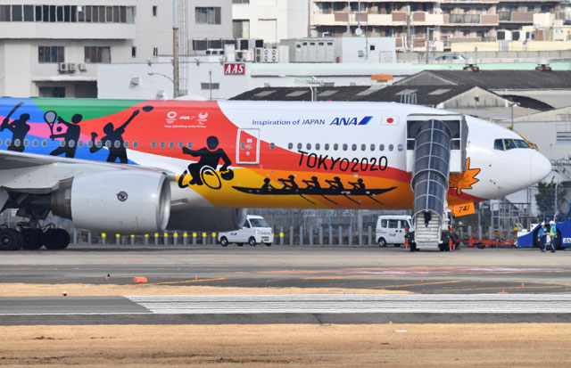 伊丹空港で出発を待つANAのHELLO 2020 JET=18年1月27日 PHOTO: Tadayuki YOSHIKAWA/Aviation Wire