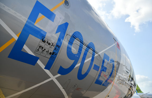 シンガポール航空ショーに展示されたE190-E2飛行試験機=18年2月6日 PHOTO: Tadayuki YOSHIKAWA/Aviation Wire