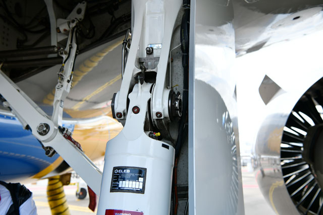 シンガポール航空ショーに展示されたE190-E2飛行試験機の主脚=18年2月6日 PHOTO: Tadayuki YOSHIKAWA/Aviation Wire
