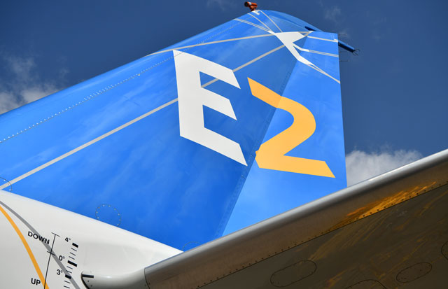 シンガポール航空ショーに展示されたE190-E2飛行試験機=18年2月6日 PHOTO: Tadayuki YOSHIKAWA/Aviation Wire