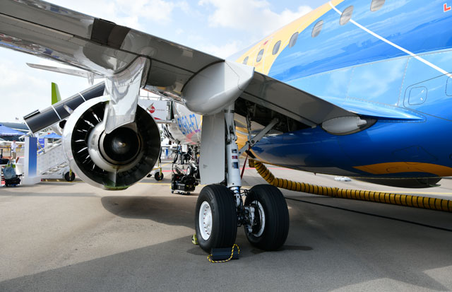 シンガポール航空ショーに展示されたE190-E2飛行試験機の主脚=18年2月6日 PHOTO: Tadayuki YOSHIKAWA/Aviation Wire