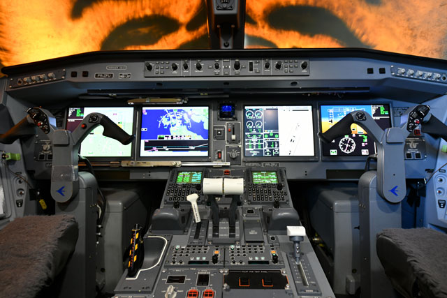 シンガポール航空ショーに展示されたE190-E2のコックピット=18年2月6日 PHOTO: Tadayuki YOSHIKAWA/Aviation Wire