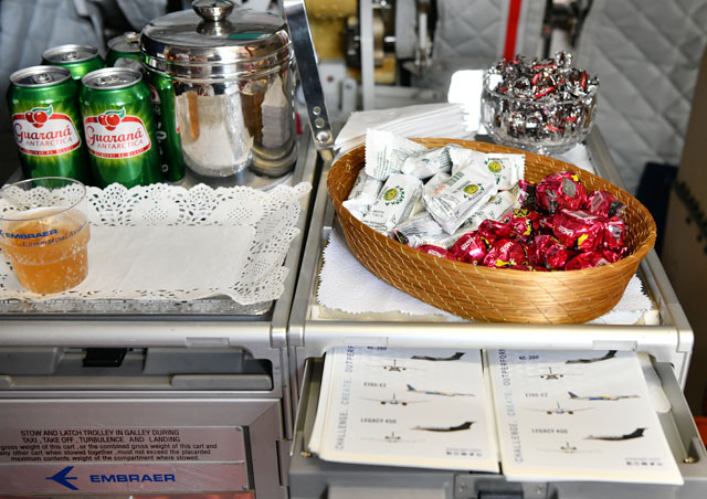 シンガポール航空ショーに展示されたE190-E2の機内に置かれたブラジルのお菓子=18年2月6日 PHOTO: Tadayuki YOSHIKAWA/Aviation Wire