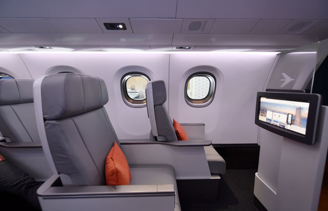 シンガポール航空ショーに出展されたE190-E2のモックアップ前方に配された上級クラス席=18年2月6日 PHOTO: Tadayuki YOSHIKAWA/Aviation Wire