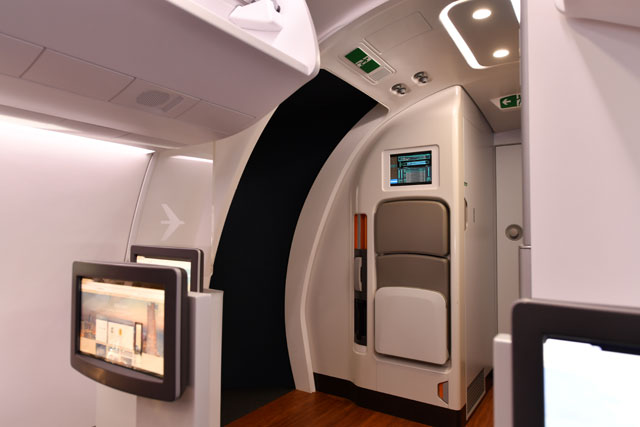 シンガポール航空ショーに出展されたE190-E2のモックアップ前方に配された上級クラス席=18年2月6日 PHOTO: Tadayuki YOSHIKAWA/Aviation Wire