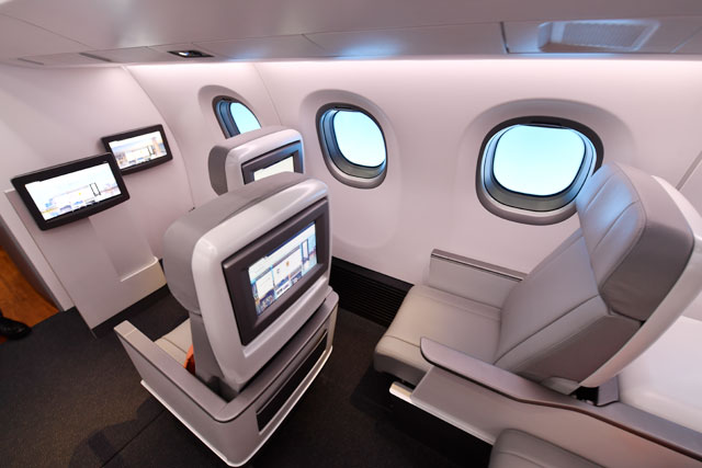 シンガポール航空ショーに出展されたE190-E2のモックアップ前方に配された上級クラス席=18年2月6日 PHOTO: Tadayuki YOSHIKAWA/Aviation Wire