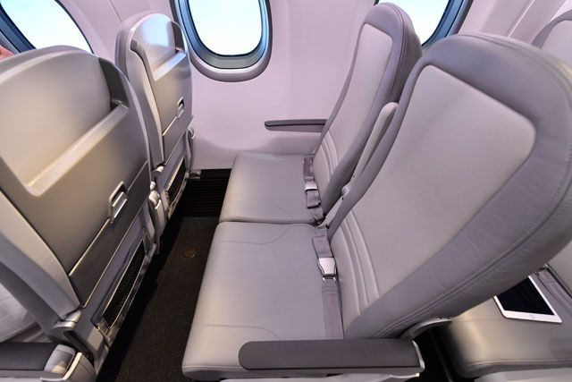 シンガポール航空ショーに出展されたE190-E2のモックアップのエコノミークラス=18年2月6日 PHOTO: Tadayuki YOSHIKAWA/Aviation Wire