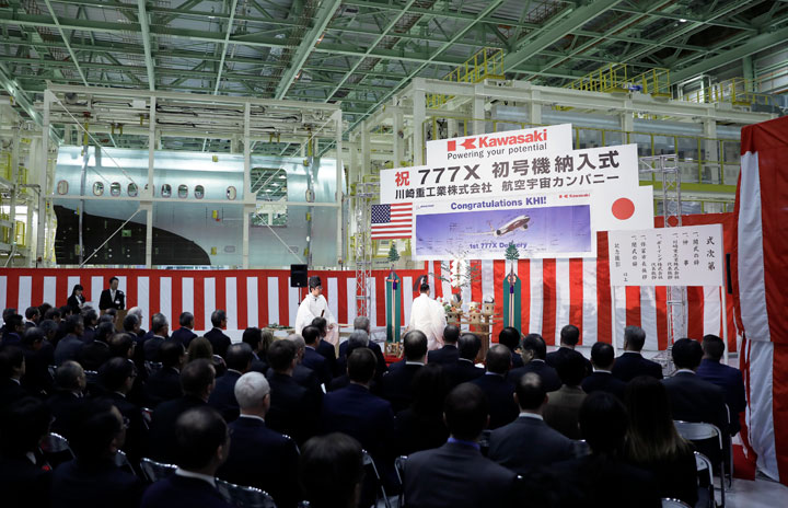 川崎重工の新工場で開かれた777X初号機用胴体パネルの納入式=18年2月6日 PHOTO: Kiyoshi OTA/Aviation Wire