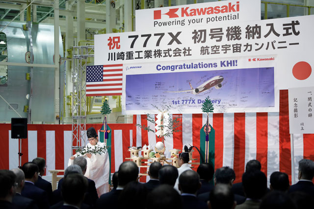 川崎重工の新工場で開かれた777X初号機用胴体パネルの納入式=18年2月6日 PHOTO: Kiyoshi OTA/Aviation Wire