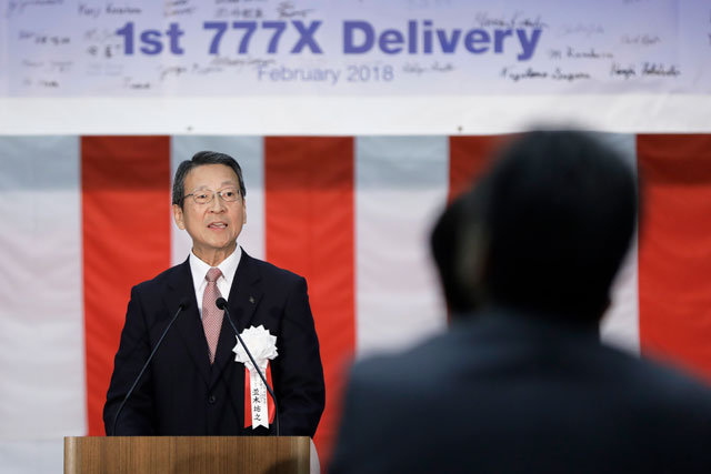 納入式であいさつする川崎重工の並木航空宇宙カンパニープレジデント=18年2月6日  PHOTO: Kiyoshi OTA/Aviation Wire