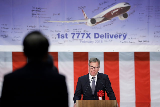 納入式であいさつするボーイング民間航空機部門のリンドブラッド777Xプログラム担当バイスプレジデント=18年2月6日 PHOTO: Kiyoshi OTA/Aviation Wire