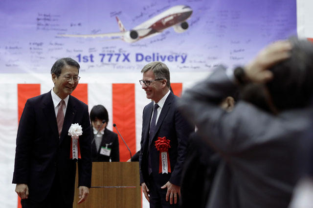 納入式後の川崎重工の並木航空宇宙カンパニープレジデント(左)とボーイング民間航空機部門のリンドブラッド777Xプログラム担当バイスプレジデント=18年2月6日 PHOTO: Kiyoshi OTA/Aviation Wire