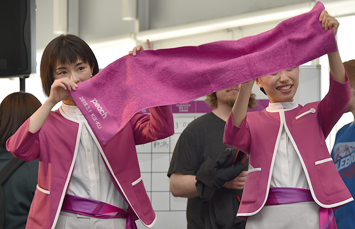 関空発新潟行きMM143便初便の乗客にプレゼントした泉州タオル=18年3月1日 PHOTO: Yusuke KOHASE/Aviation Wire
