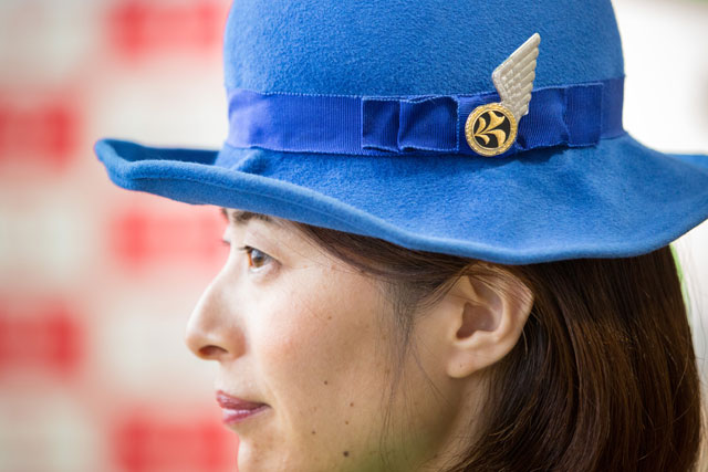 TDAの客室乗務員3代目制服の帽子=18年3月1日 PHOTO: Tatsuyuki TAYAMA/Aviation Wire