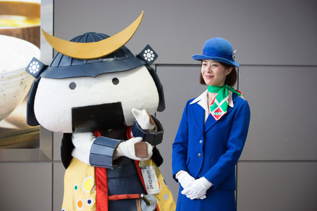 TDAの客室乗務員3代目制服を着用したJAL東北支店の社員(右)と仙台・宮城のPRキャラクター「むすび丸」=18年3月1日 PHOTO: Tatsuyuki TAYAMA/Aviation Wire