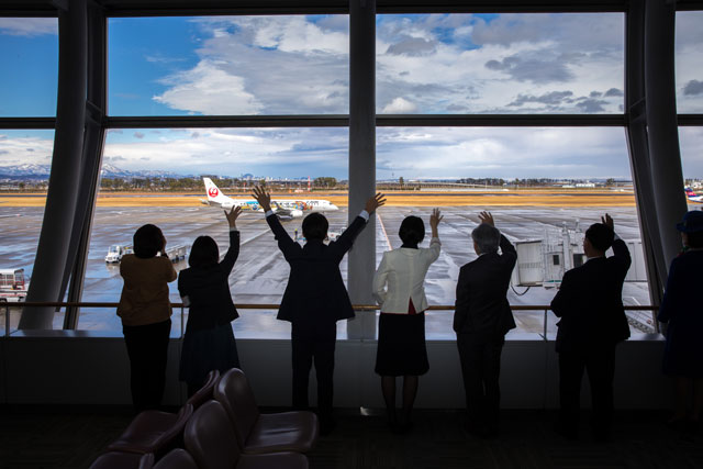 JAL社員らに見送られて仙台空港を出発する福岡行きJL3530便=18年3月1日 PHOTO: Tatsuyuki TAYAMA/Aviation Wire