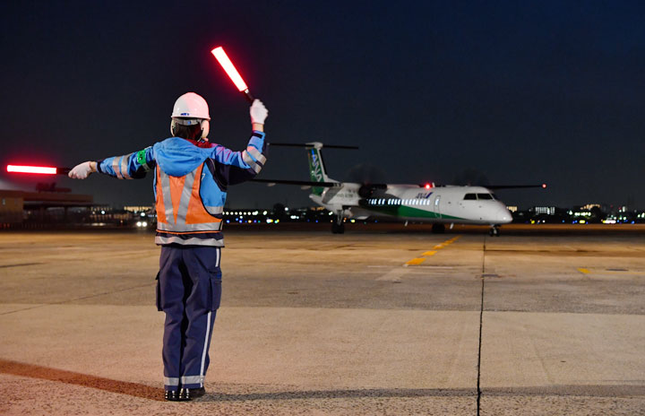 伊丹空港の駐機場に進入するANAのエコボン最終便NH1856便=18年3月12日 PHOTO: Tadayuki YOSHIKAWA/Aviation Wire