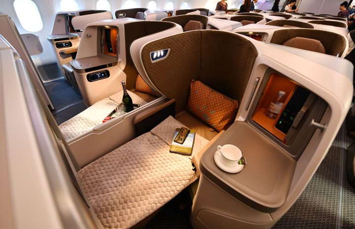 チャンギ空港で公開されたシンガポール航空の787-10のビジネスクラス新シート=18年3月28日 PHOTO: Tadayuki YOSHIKAWA/Aviation Wire