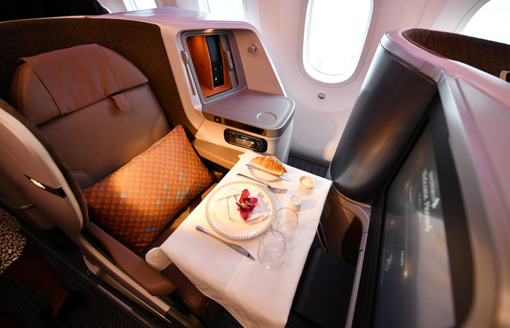 チャンギ空港で公開されたシンガポール航空の787-10のビジネスクラス新シート=18年3月28日 PHOTO: Tadayuki YOSHIKAWA/Aviation Wire
