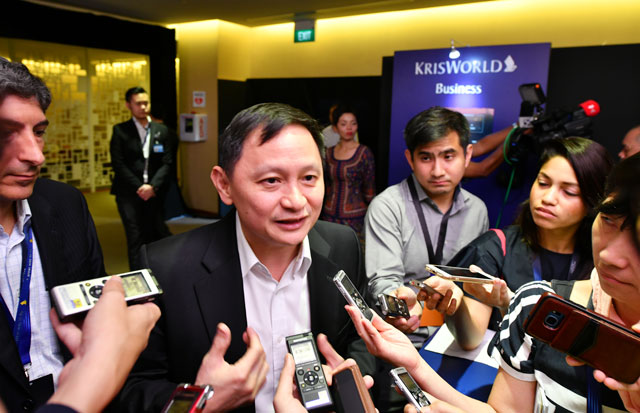 チャンギ空港で787-10について報道陣に説明するシンガポール航空のゴー・チュン・ポンCEO=18年3月28日 PHOTO: Tadayuki YOSHIKAWA/Aviation Wire