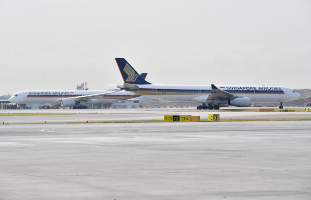 シンガポール航空のA350-900(左)とA330-300=18年3月28日 PHOTO: Tadayuki YOSHIKAWA/Aviation Wire